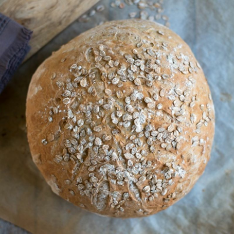 Pensle brødet med litt vann og strø over rugflak til pynt, eller la det være som det er.
