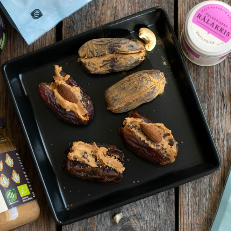 Daddel med lakrispulver og mandel lages ved å dele daddelen i to og fjern eventuell stein.