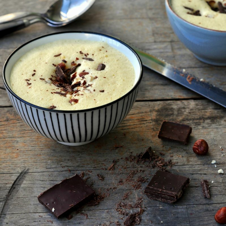 Vend inn appelsinjuice i eggedosisen og topp med nøtter og sjokolade rett før servering.