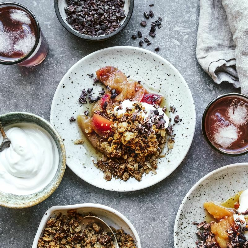 Eplekompott med sprø crumble, planteyoghurt og kakaonibs