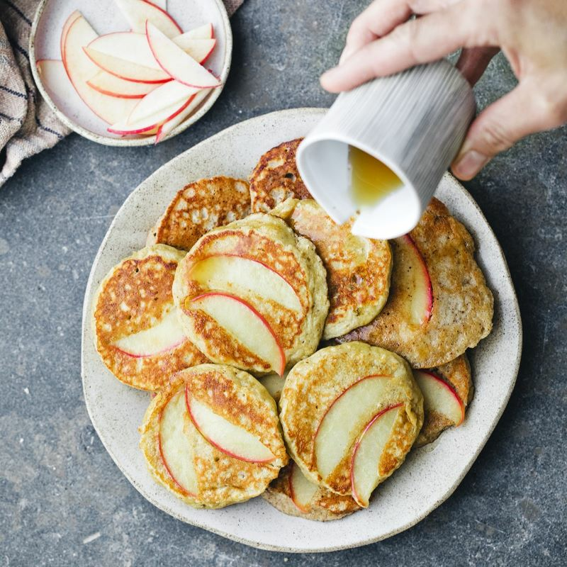 Disse eplepannekakene er en sunnere, glutenfri variant av tykke amerikanske bananpannekaker, med eplemos i stedet for banan. Raske frokostpannekaker som smaker nydelig på høsten.