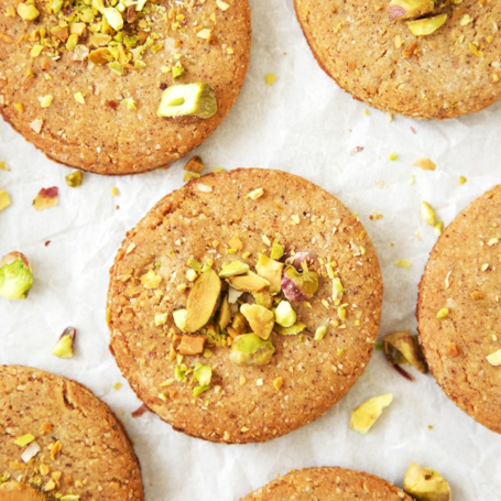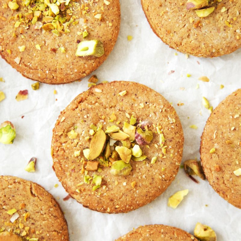 Hasselnøttsmør kan også brukes til bakst, disse myke småkakene topper du med pistasjnøtter.