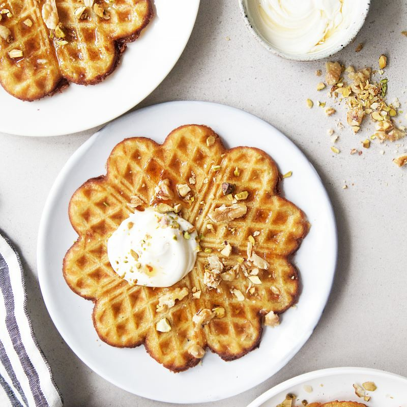 Stek vaflene og topp gjerne med yoghurt, nøtter og sirup.