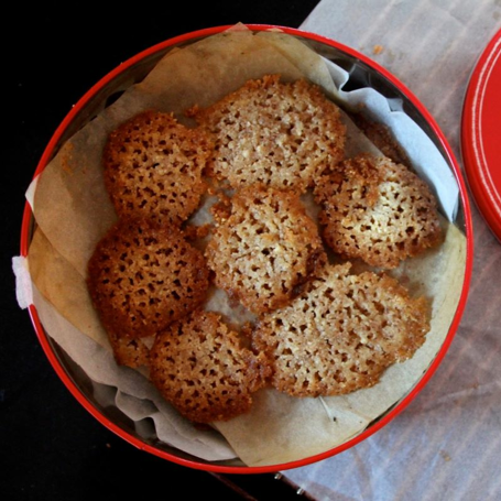 Avkjøles og legges i kakeboks med matpapir mellom lagene.