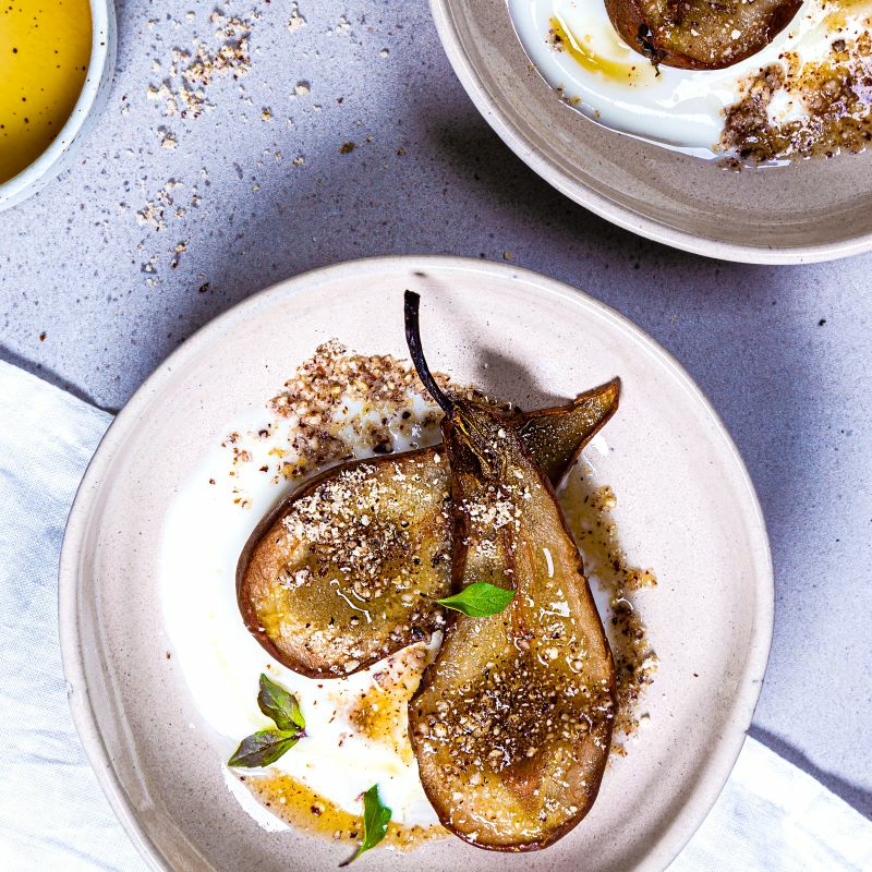 Ovnsbakt pære med kesam og lønnesirup