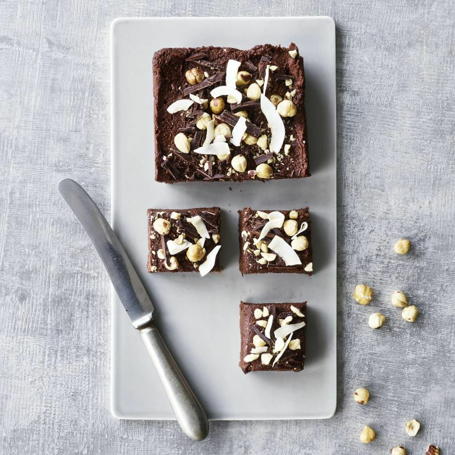 Dekorer kaken med resten av de ristede hasselnøttene og kokos.
