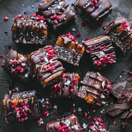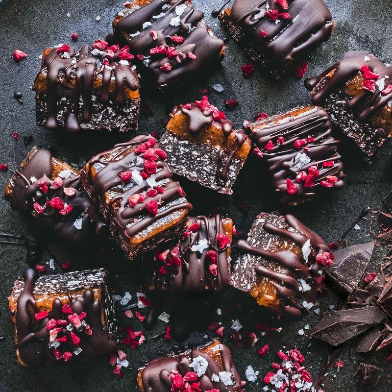 Sjokolade, peanøttsmør, dadler, salt og syrlige bringebær er en perfekt kombinasjon om man ønsker å lage en vegansk og litt sunnere søtsak.