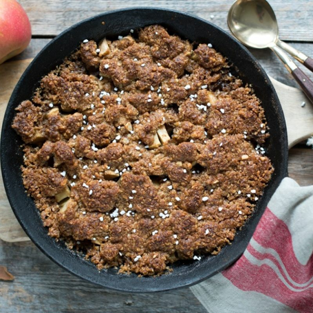 Fordel smuldredeigen over eplene og stek midt i ovnen i ca 30 minutter.