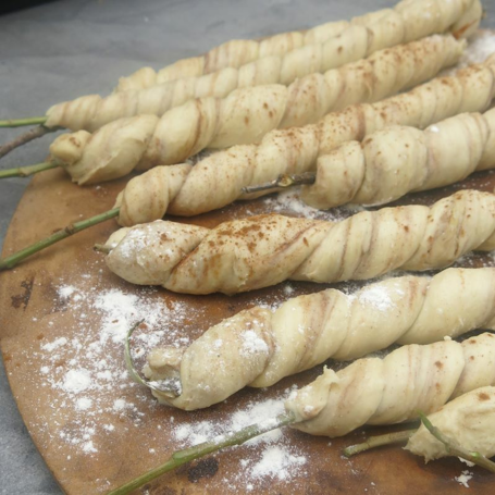 Fordel deigen i emner, rull dem ut til lange pølser og snurr dem rundt pinnene.