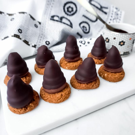 Hold kjeksene med sjokolademousse opp-ned og dypp de i glasset med smeltet sjokolade.