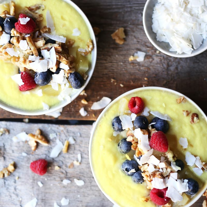 Bland sammen alle ingrediensene til smoothien i en blender, kjør til en tykk og kremaktig konsistens.