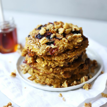 Enkle frokostpannekaker med havregryn og blåbær servert med lønnesirup.