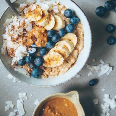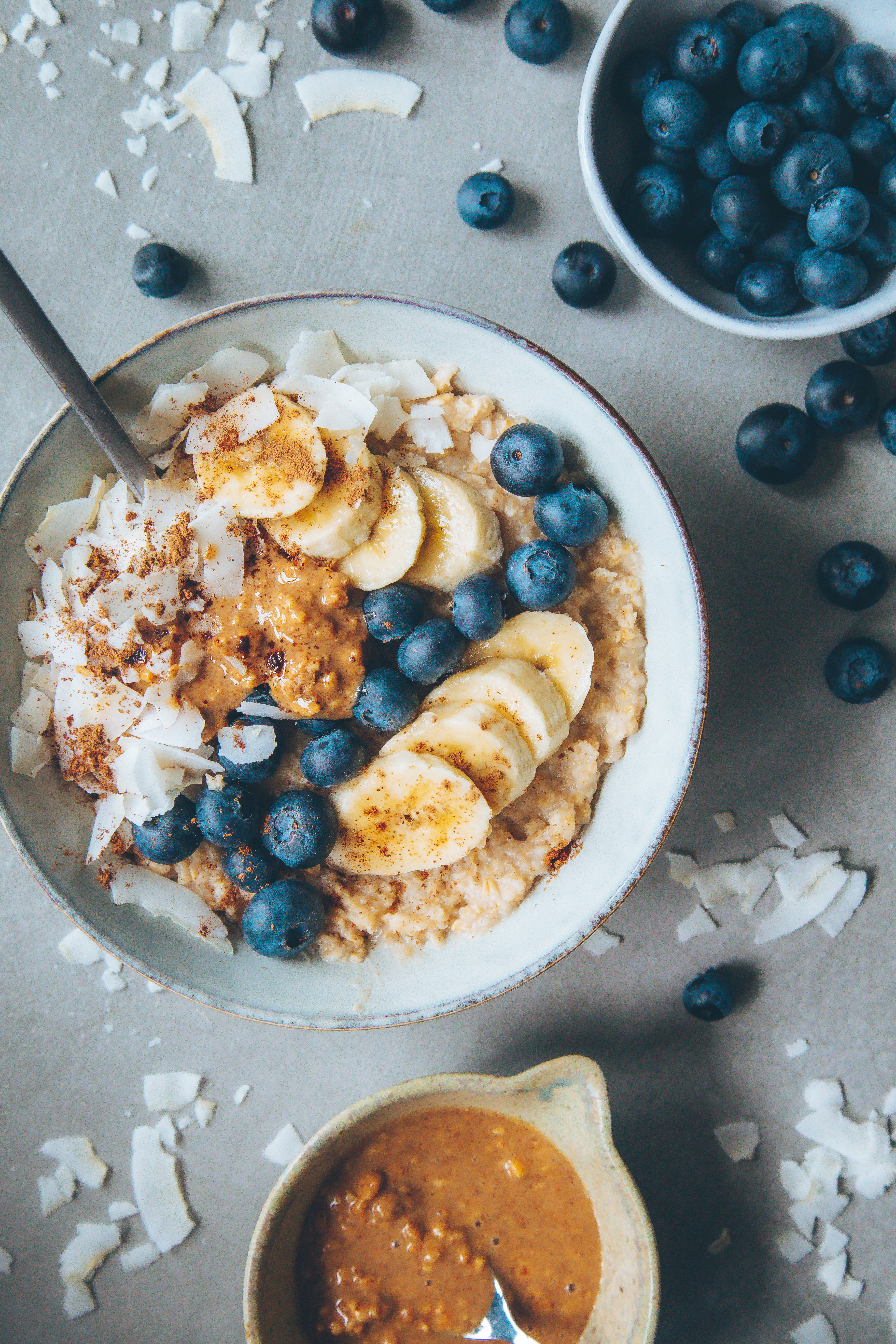 Topp med blåbær, bananer, kokosflak, peanøttsmør og kanel.