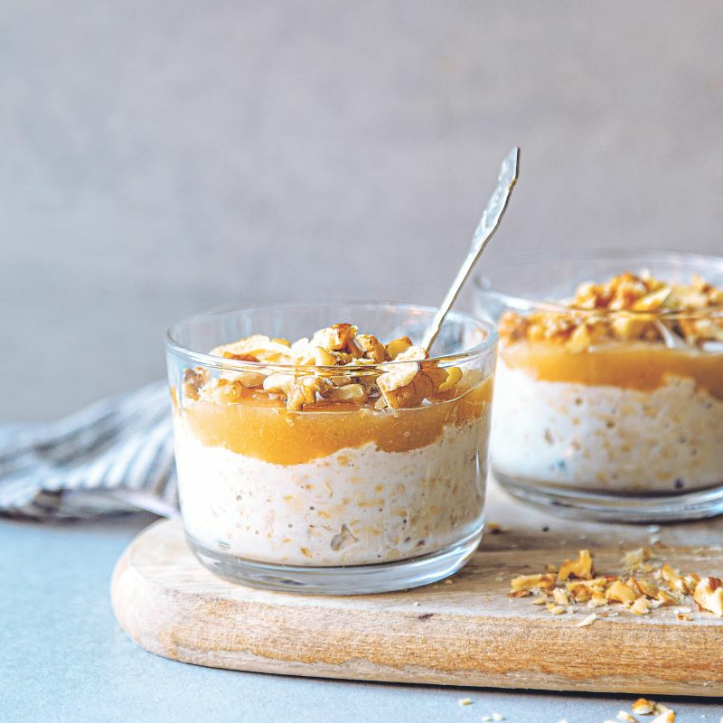 Kjøleskapsgrøt passer perfekt som frokost, lunsj eller mellommåltid. Spar tid og rør sammen grøten kvelden før. Topp med eplesyltetøy og hakkede nøtter, det er supergodt!