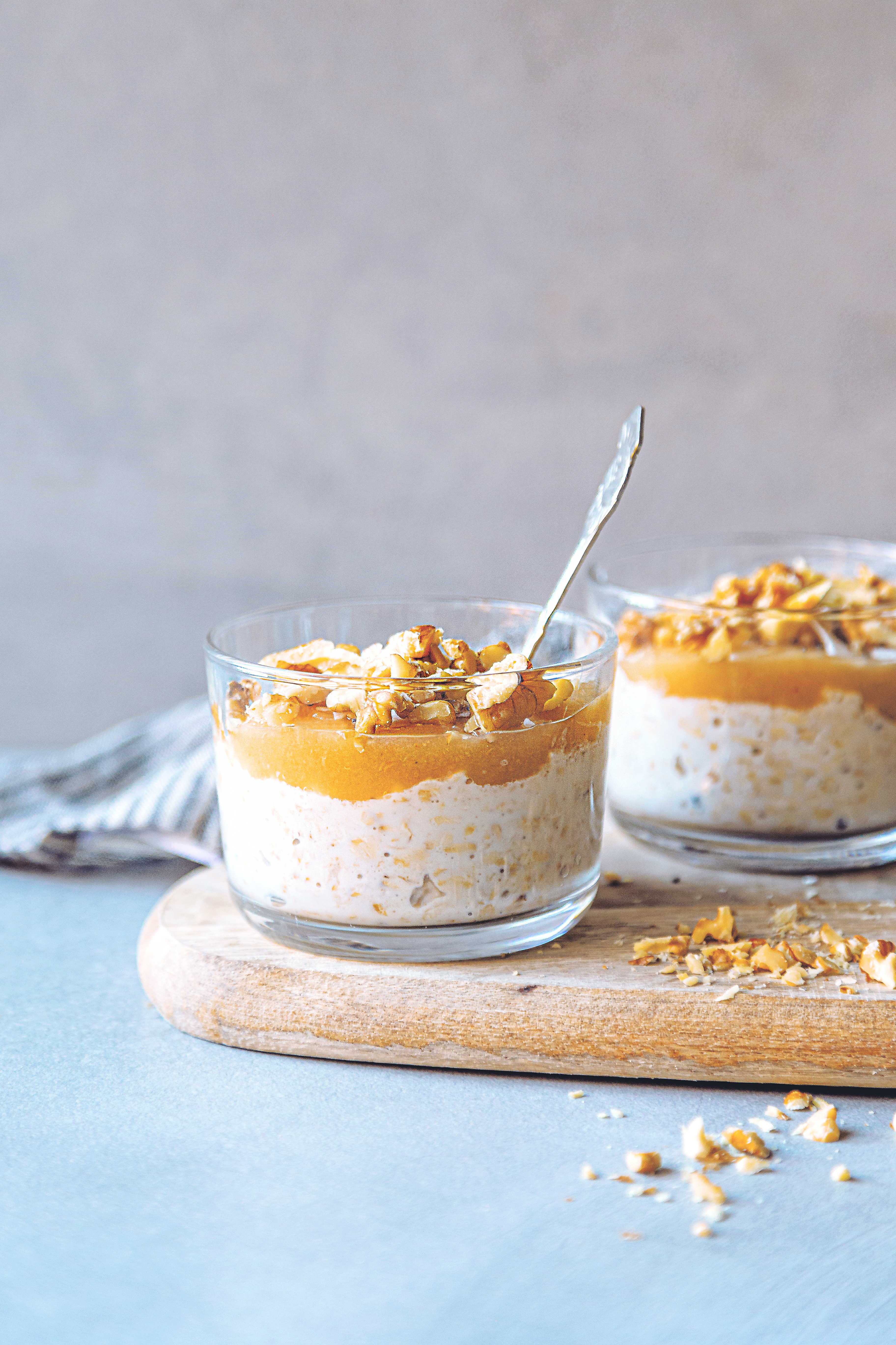 Kjøleskapsgrøt passer perfekt som frokost, lunsj eller mellommåltid. Spar tid og rør sammen grøten kvelden før. Topp med eplesyltetøy og hakkede nøtter, det er supergodt!