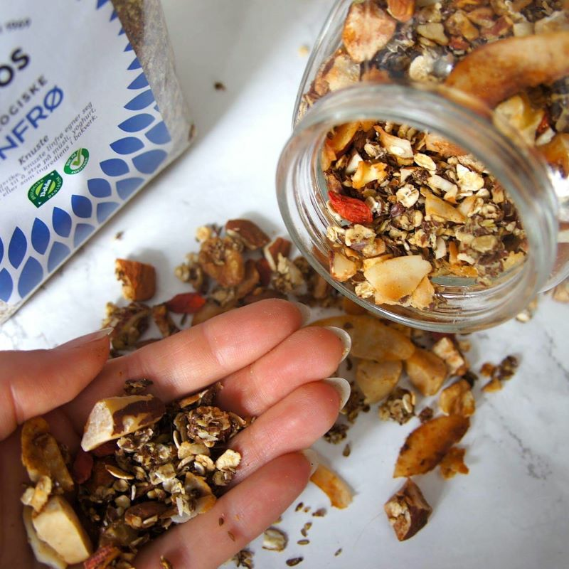 En deilig granola som inneholder lite sukker og passer perfekt som topping på frokosten eller mellommåltidet.