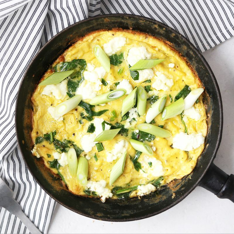 Dryss over fetaost og sett i ovnen. Stek i 2-4 minutter til fetaosten er smeltet og omeletten er lett gyllen.
