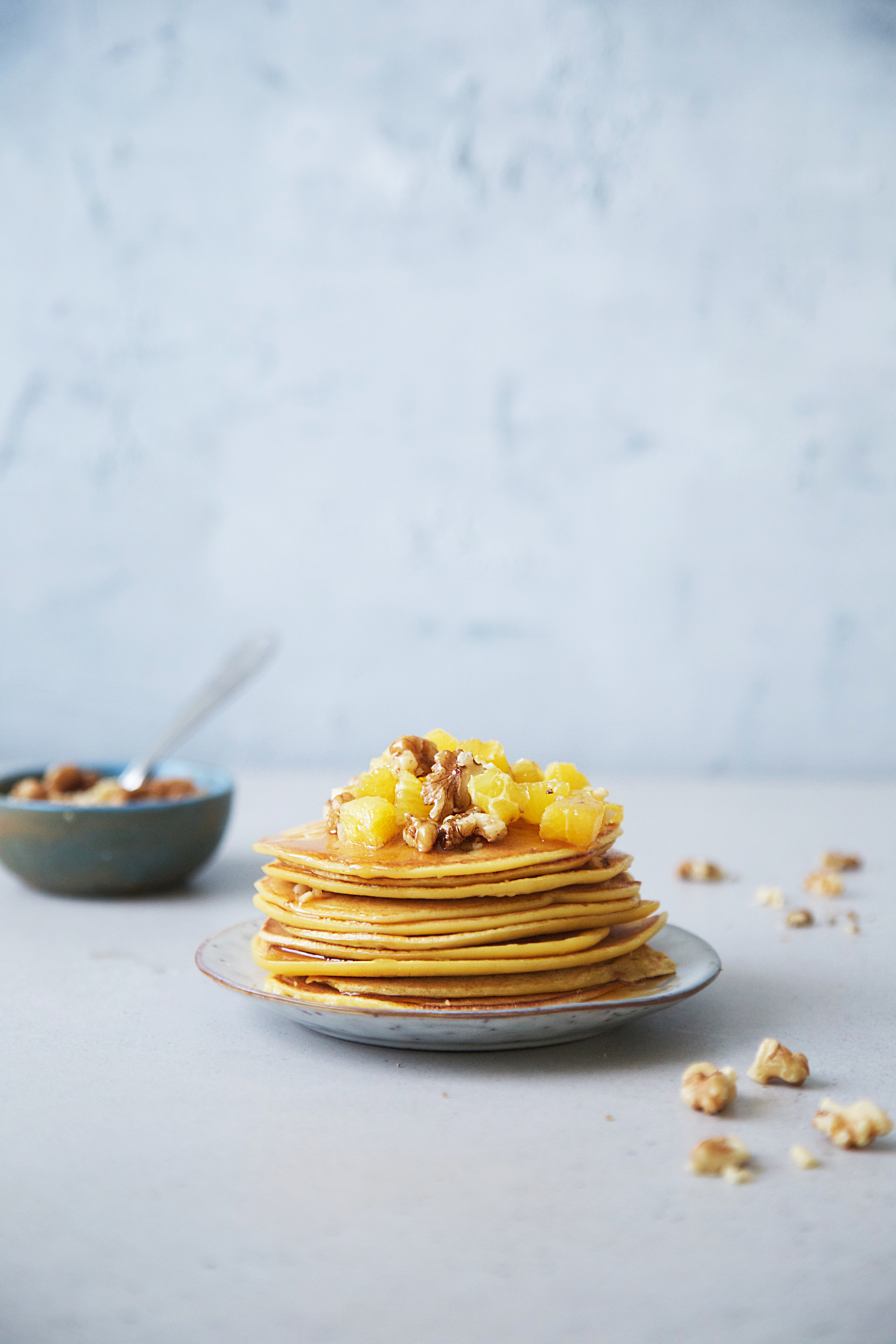 Pannekaker med speltmel - til frokost, lunsj elller middag! Varier med toppingen og stek store, eller små, pannekaker. Her får du en oppskrift toppet med appelsin, lønnesirup og nøtter.
