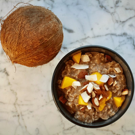 En deilig mettende sunn og god grøt med smak av kokos og mango. Du kan velge å legge i mangoen helt mot slutten hvis du ønsker en friskere smak, men denne måten gir retten en søt og varm smak av mango som passer veldlig godt sammen med de andre gode smakene i grøten. Du kan gjerne bytte ut mangoen med andre frukter som f.eks ananas, pære eller bananbiter. Prøv deg frem!