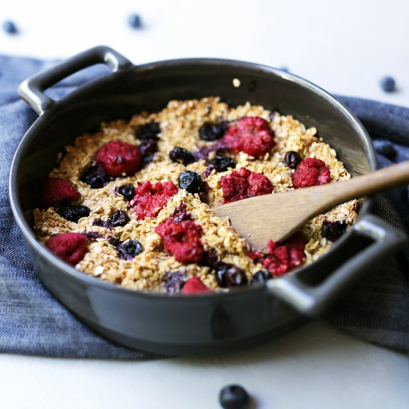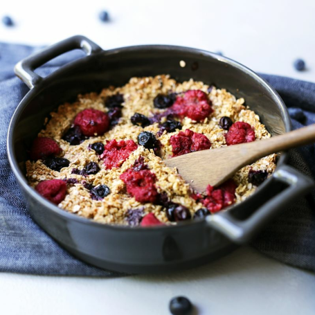 Superenkel form i ovnen med havregryn, lønnesirup og friske bær.