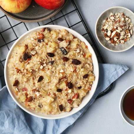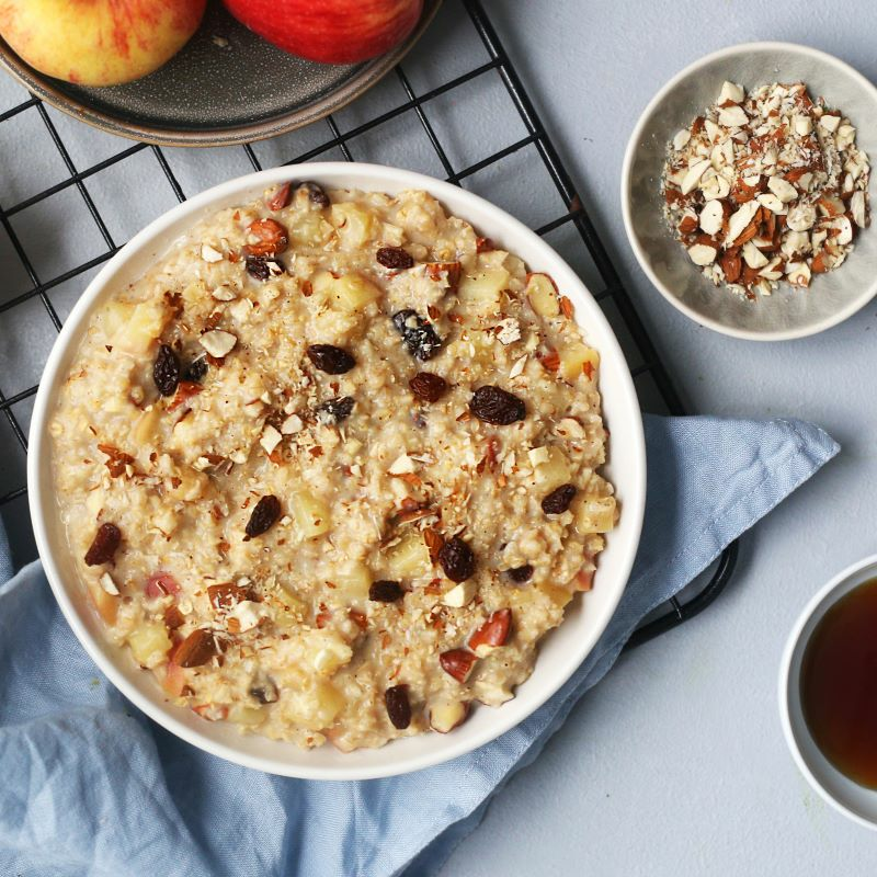 Så tilsetter du melk, havregryn, rosiner og halvparten av nøttene og lar det putre videre i noen minutter til havregrynene er kokt og blandingen er passe tykk.