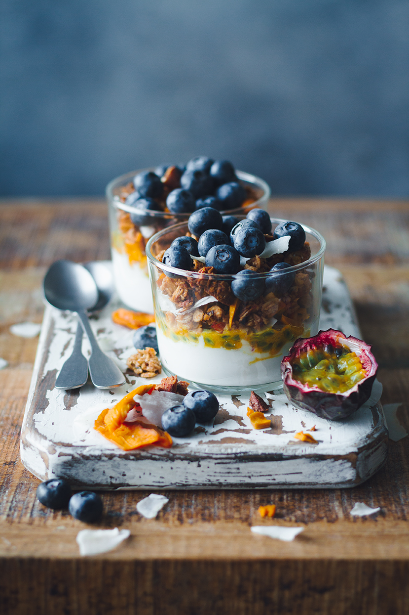En deilig, tropisk granola søtet med frukt, dadler og lønnesirup. Perfekt som topping på chiapuddingen eller smoothie bowlen.