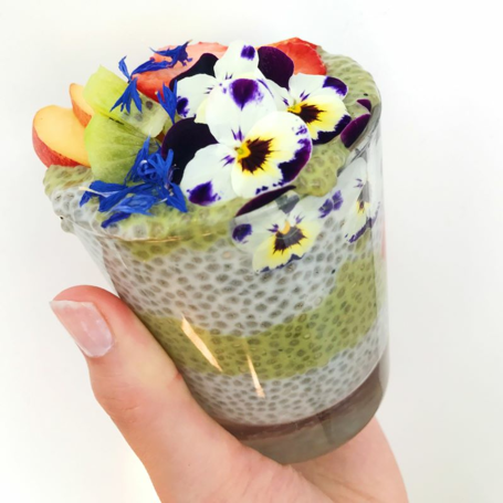 Hell vanilje chia puddingen og matcha chia puddingen annenhver gang over i et glass slik at annethvert lag er grønt og hvitt.