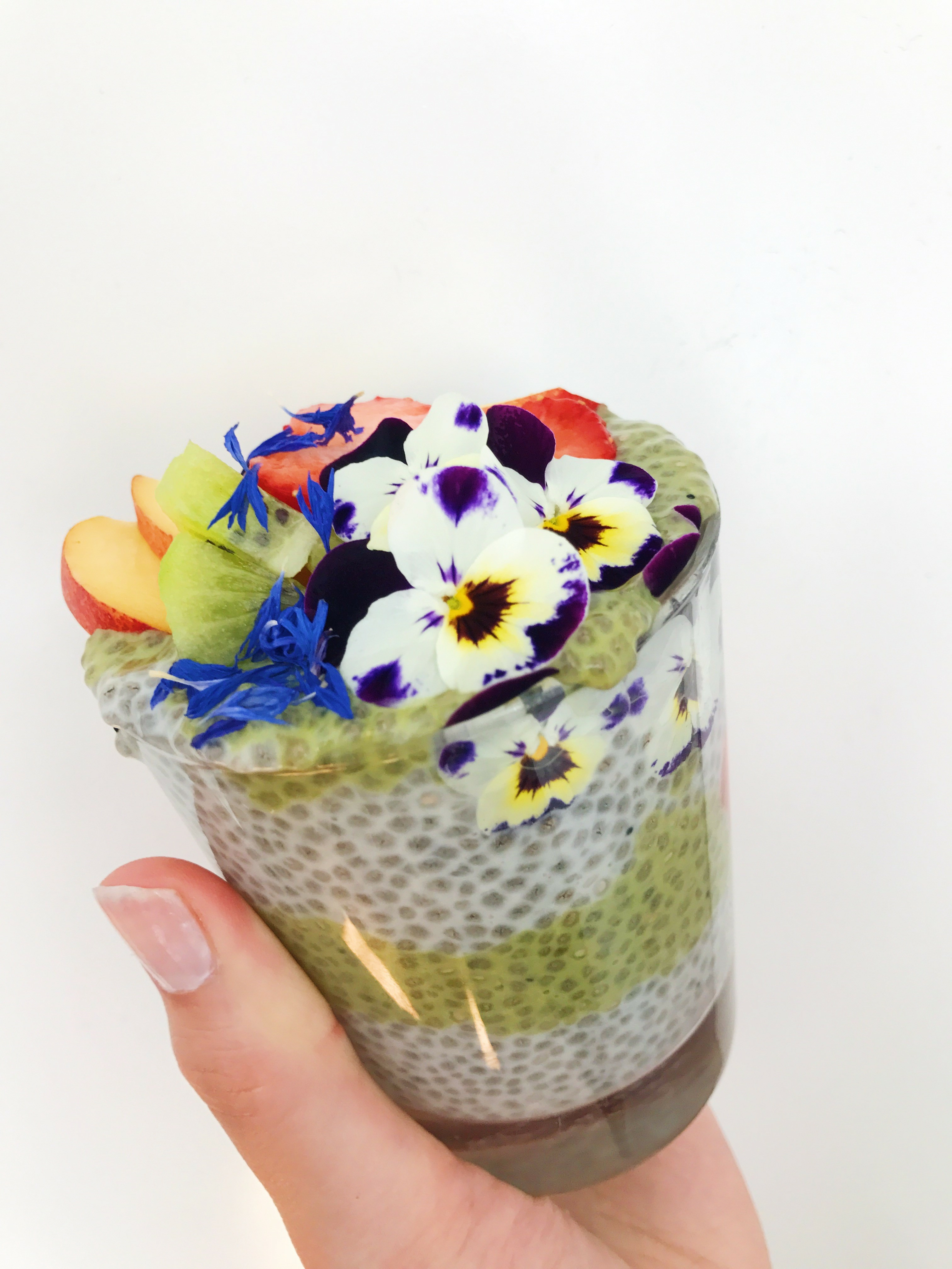 Topp med jordbær, kiwi, fersken og stemorsblomster eller dine favoritt toppings.