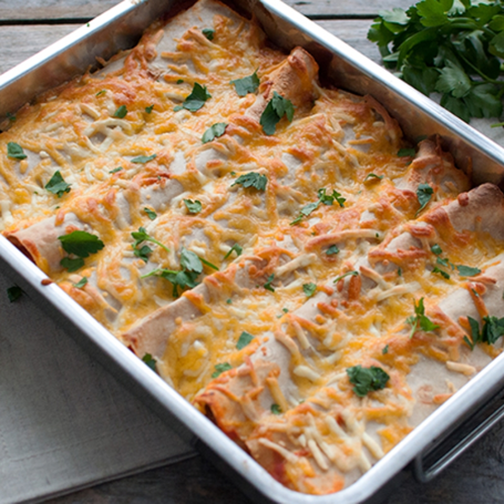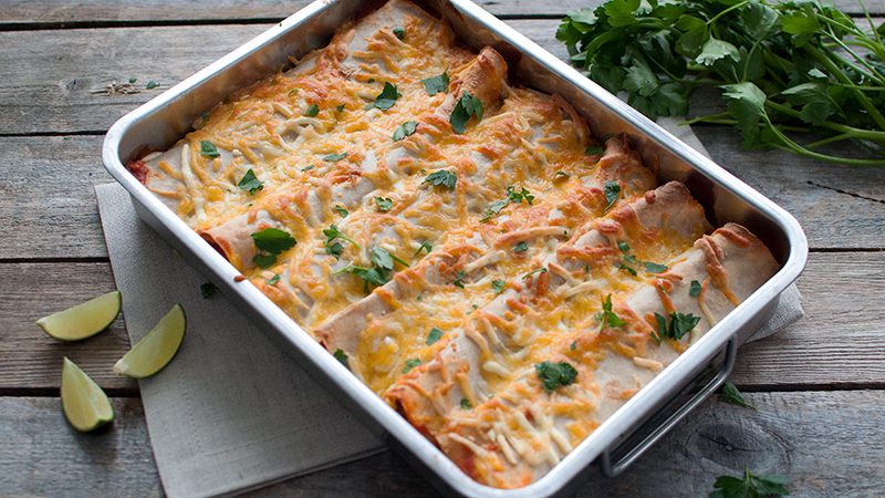 Øs tomatsausen opp i en tortillalefse, rull sammen med skjøten ned i en ildfast form.