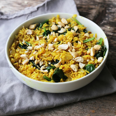 Gul ris blandet med spinat, cashewnøtter og løk.