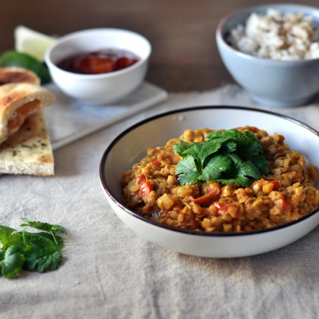 Server daal med mango chutney, yoghurt, ris og naanbrød.