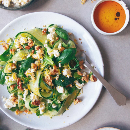 Denne enkle, grønne salaten med agurk, fetaost, urter og ruccola topper du med nøtter og en deilig honningdressing.