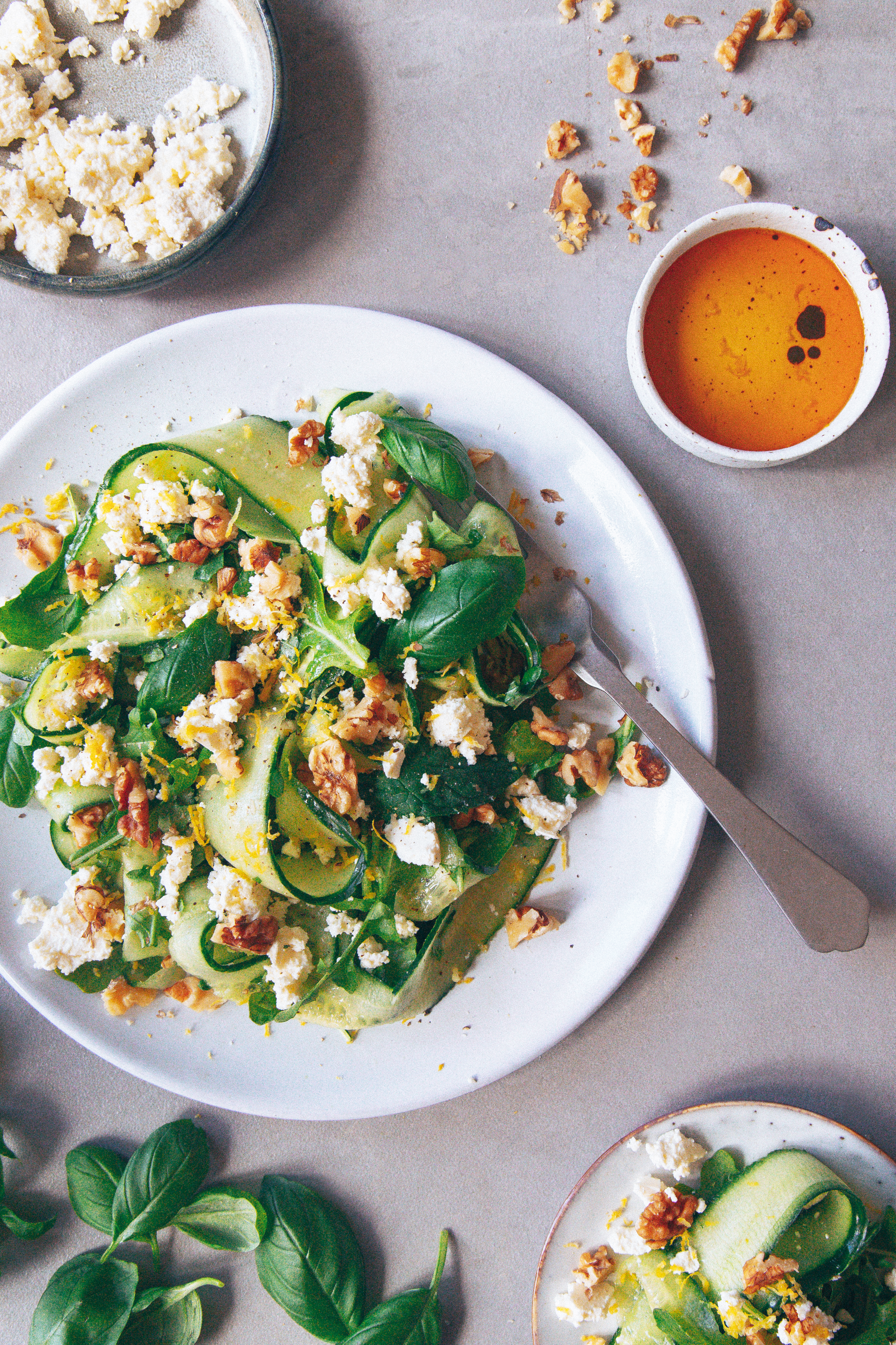 Denne enkle, grønne salaten med agurk, fetaost, urter og ruccola topper du med nøtter og en deilig honningdressing.