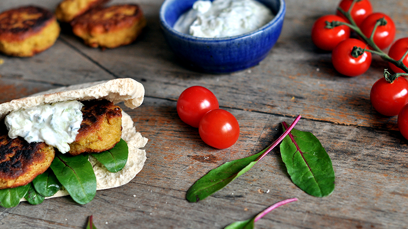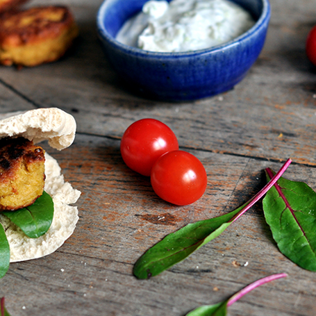 Server falafler med salat, tomater og tzatziki i pitabrød.