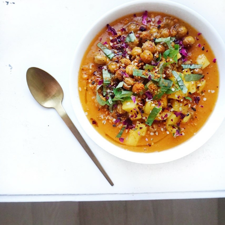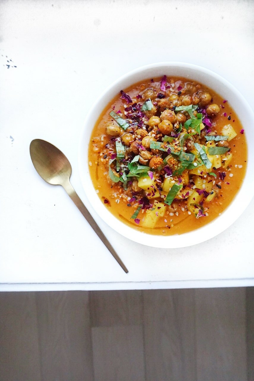En deilig gulrot- og mangosuppe som er toppet med sprø kikerter.