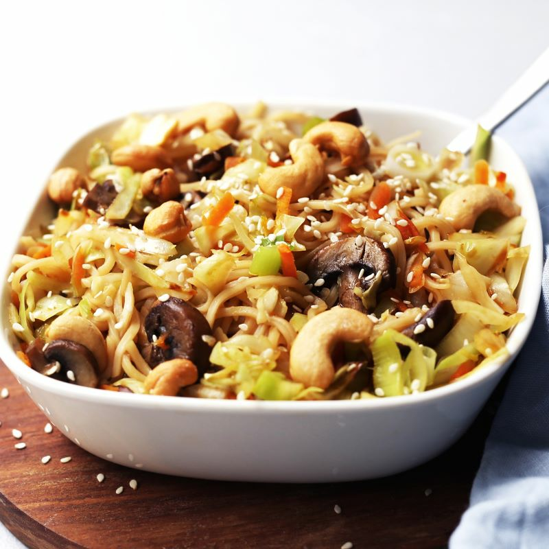 Så tilsetter du vårløk, gulrot, nøtter og kål og freser videre i noen minutter.
