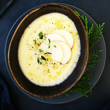 Pynt suppen med epleskiver, olivenolje og frisk timian.