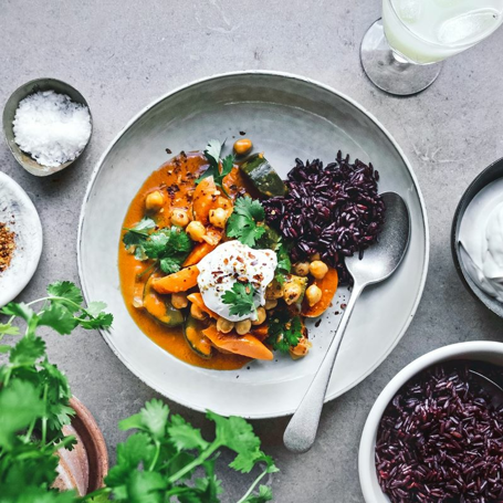 Server gryten sammen med ris, en dæsj yoghurt, fersk koriander og chiliflak.