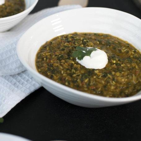 Dette er en deilig og mettende suppe med litt tyggemotstand. Den er vegansk om du dropper å toppe den med yoghurt, og smaker ekstra godt servert med nanbrød og toppet med litt ekstra hakket chili.