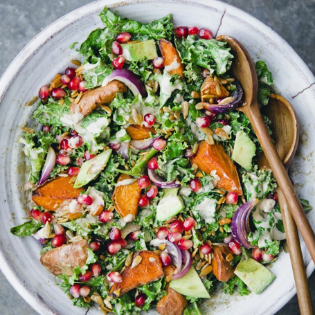 Noe av det beste du kan gjøre med grønnkål er å vende den inn i en superkremet og litt søt-sur tahinidressing sammen med ristede søtpotetbiter, avokado og granateple. Garantert en smaksbombe!