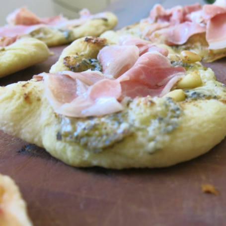 Sprikle gjerne litt god olivenolje over pizzaene før steking, og særlig langs skorpene, så blir den sprø og deilig!
