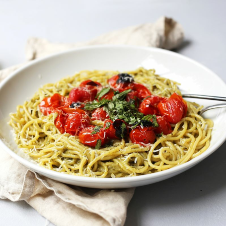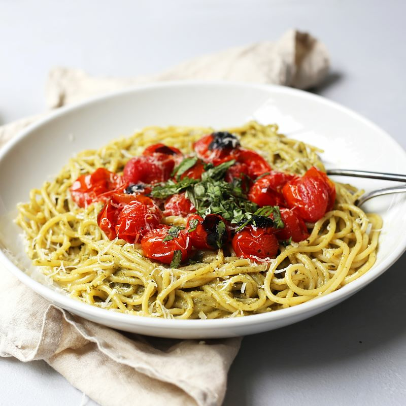 En superenkel rett som fort blir en favoritt! Bakte tomater passer perfekt med pasta.