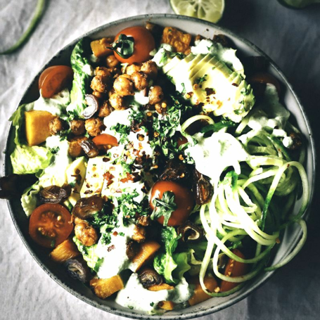 Salat med søtpotet, avokado og krydrede kikerter med yoghurtsaus