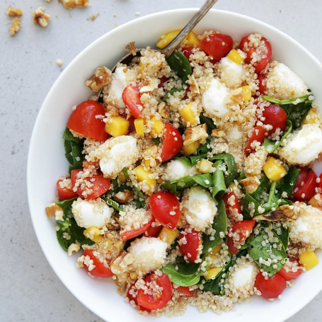 En superenkel, frisk og saftig salat med spinat, mozzarella, mango, tomater og quinoa.