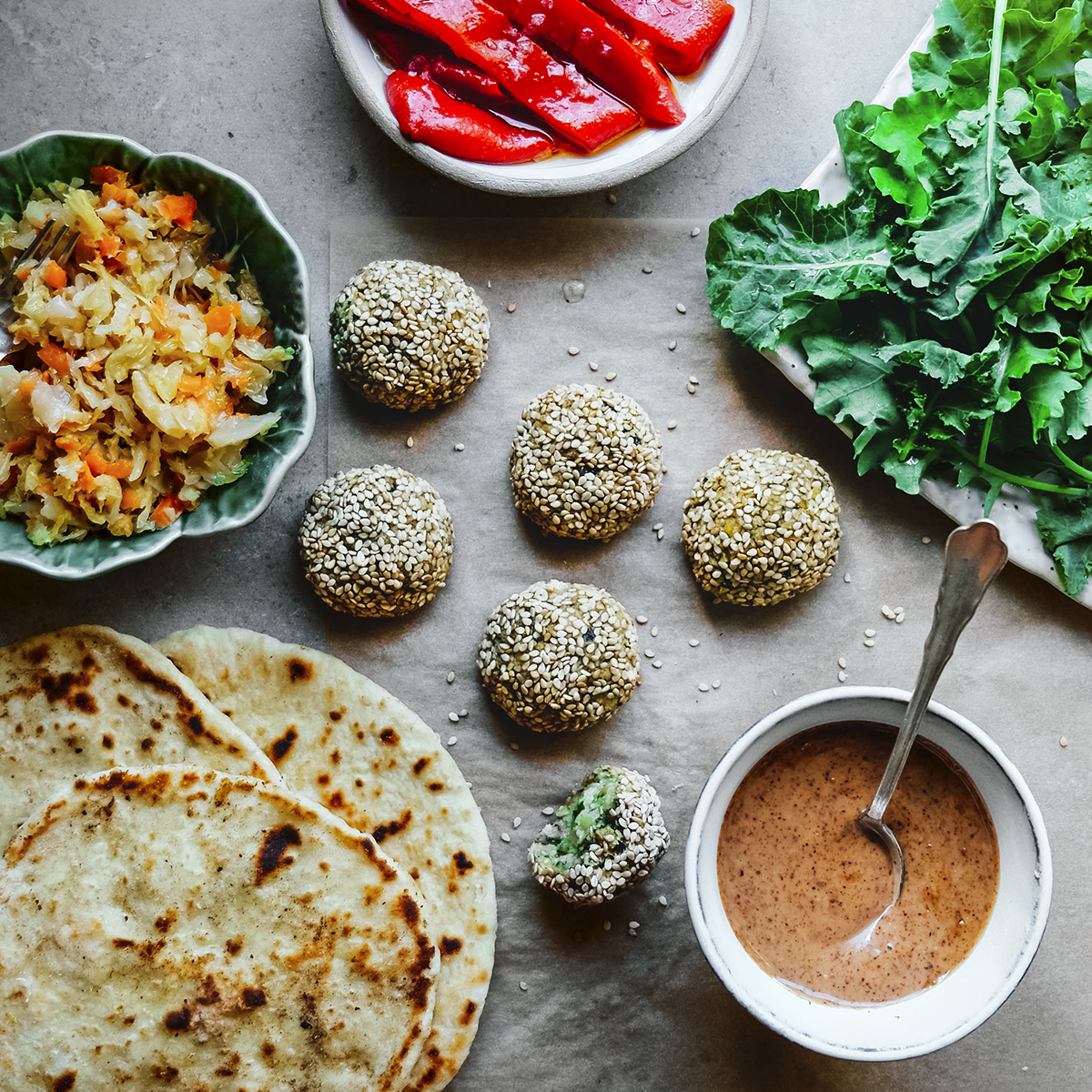 Server de nystekte brødene fylt med grønt, linseboller, paprika, kimchi og mandeldressing.