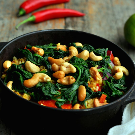 Stekt karriris med spinat og cashew