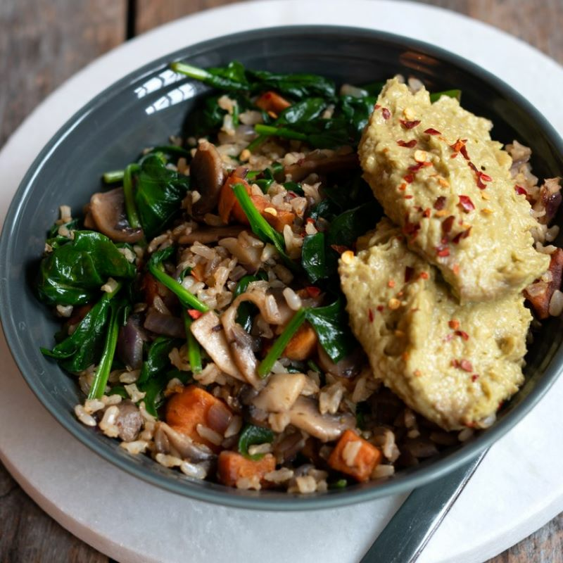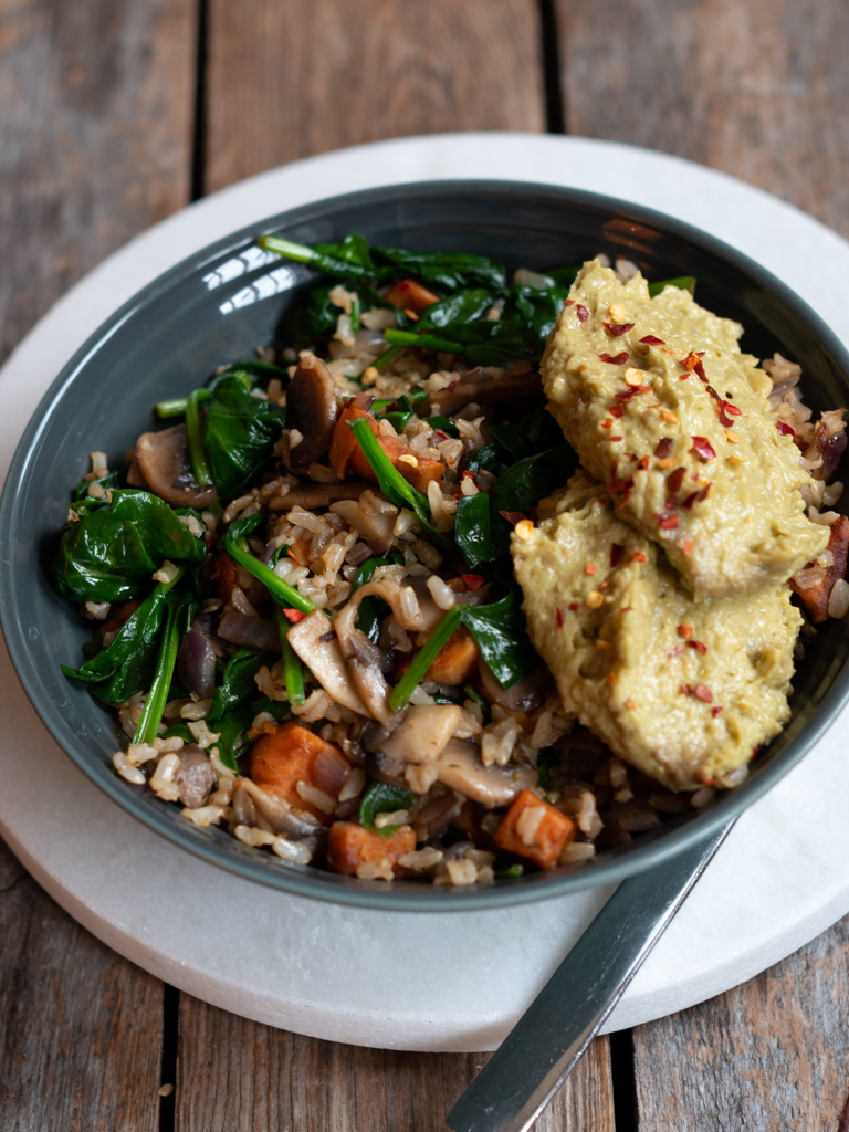 Server stekt spinat med grønsaker sammen med avokado-hummus.