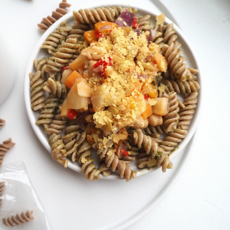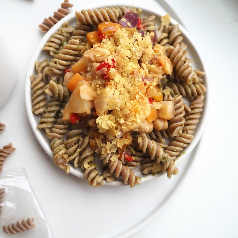 Enkel vegetar pastarett. Bli god og mett uten kjøtt og med masse smakfulle grønnsaker.