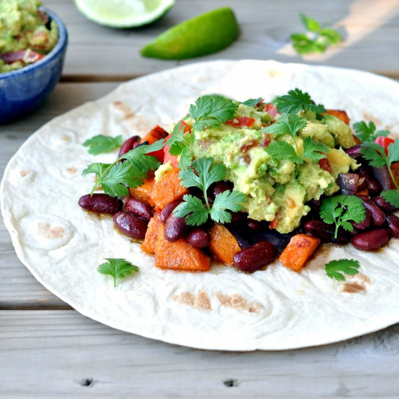 Wraps med krydret søtpotet, kidneybønner og guacamole