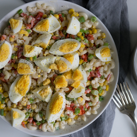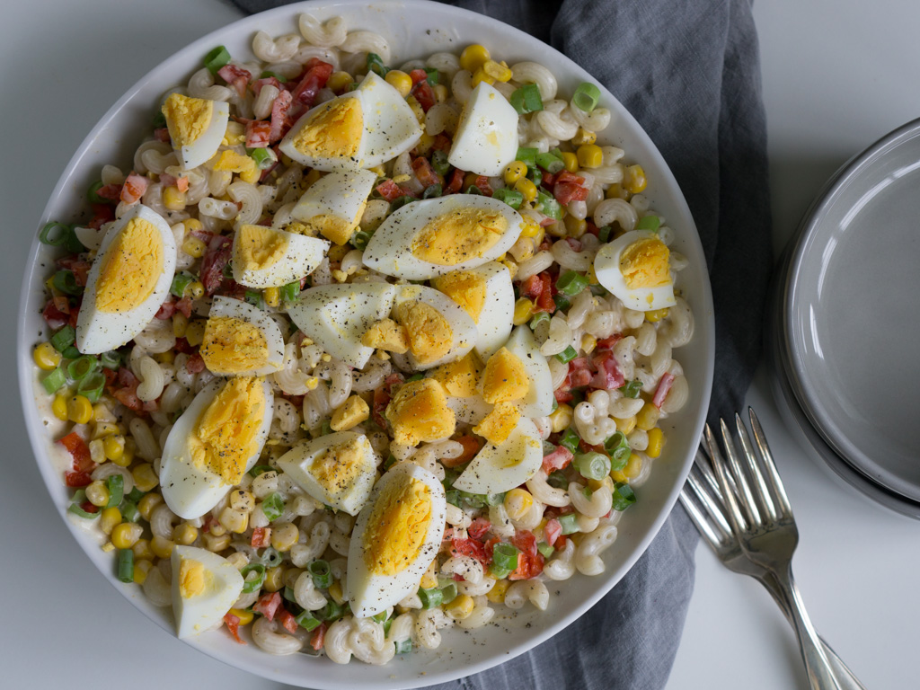 Vend makaronien inn i dressingen og bland så inn mais, paprika og vårløk i små biter.